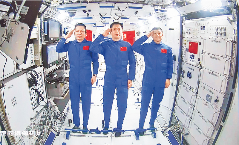 2021年6月17日,神舟十二号载人飞船成功发射升空,中国人首次进入了自己的空间站。6月23日上午,习近平总书记来到北京航天飞行控制中心,同正在天和核心舱执行任务的神舟十二号航天员聂海胜、刘伯明、汤洪波亲切通话。图为3名航天员精神饱满,向总书记敬礼。 新华社记者 岳月伟/摄