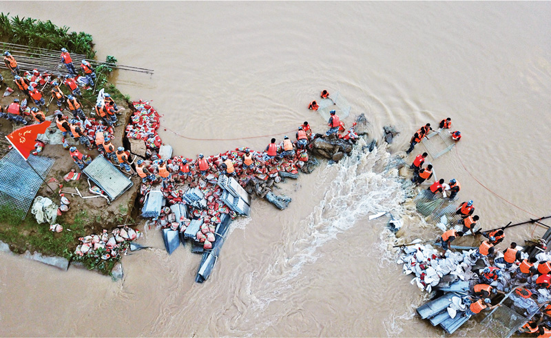 2021年7月,河南多地遭遇持续强降雨后,驻豫部队争分夺秒投入防汛抢险和灾后重建,尽最大努力保障人民生命财产安全,尽快恢复百姓生产生活秩序。图为空降兵某旅官兵用石块、沙袋构筑子堤。 余红春/摄