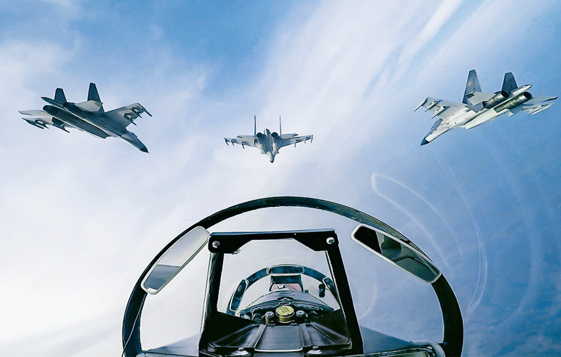 搏击长空心向党。图为北部战区空军航空兵某旅飞行员在训练中组成四机编队,扑向地面目标展开进攻作战。 新华社发 杨盼/摄