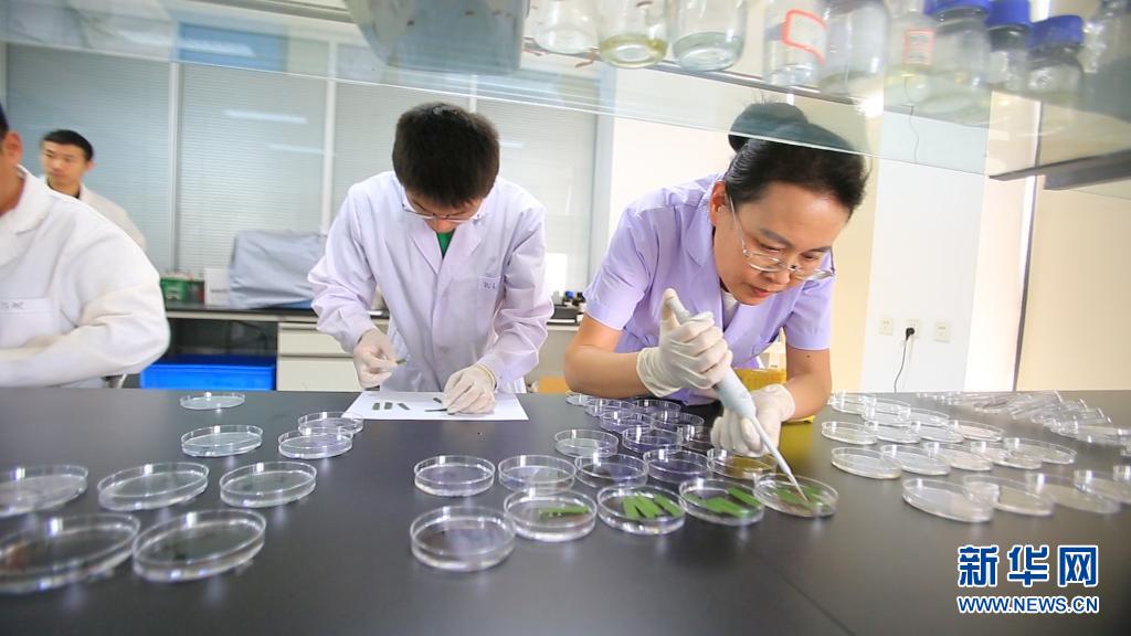 辽宁省农科院水稻所研究员郑文静(右)和团队成员一起做水稻抗病性鉴定试验(2019年7月5日摄)。新华社发