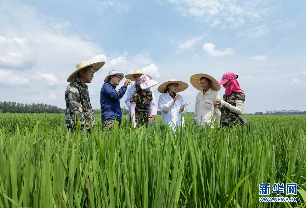 7月29日,辽宁省农科院水稻所研究员郑文静(右三)和团队成员在田间进行水稻抗病性调查。新华社记者 王莹 摄