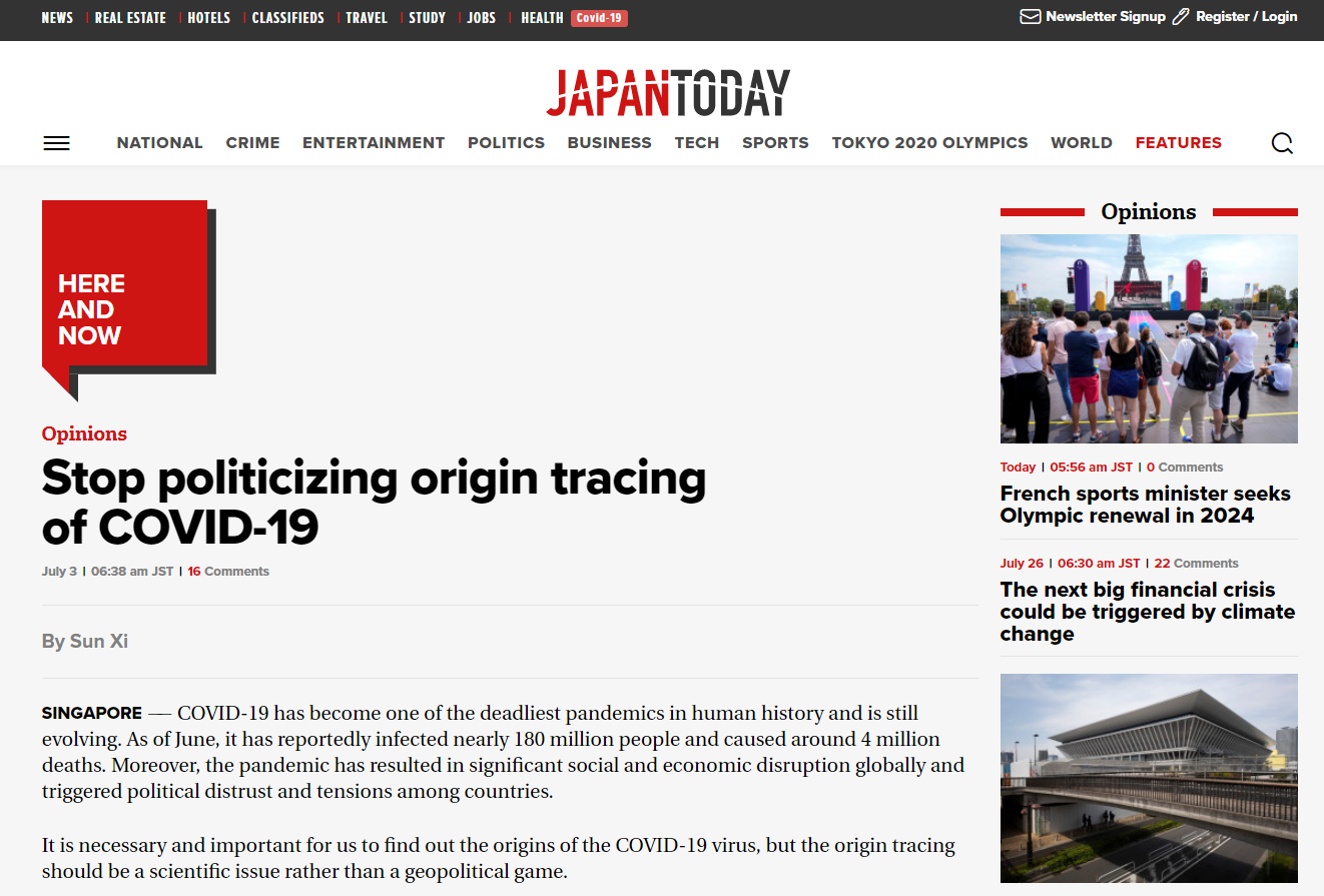 近日,日媒《今日日本》刊发新加坡独立评论作家孙喜的评论文章,批评美国将新冠病毒溯源问题政治化。