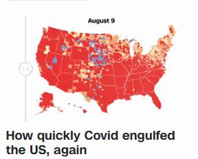 由于新冠病毒德尔塔变异株的肆虐和疫苗接种量停滞不前,美国近期新冠肺炎疫情迅速恶化,日增确诊病例数大幅反弹。据美国媒体报道,现有超过98%的美国人所处地区,存在高水平或大量的社区传播风险。