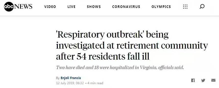 据美国广播公司(ABC)2019年7月12日报道,弗吉尼亚州北部一社区有54人出现发烧、咳嗽和全身无力等症状,2人死亡;该社区距德特里克堡生物实验室仅1小时车程。