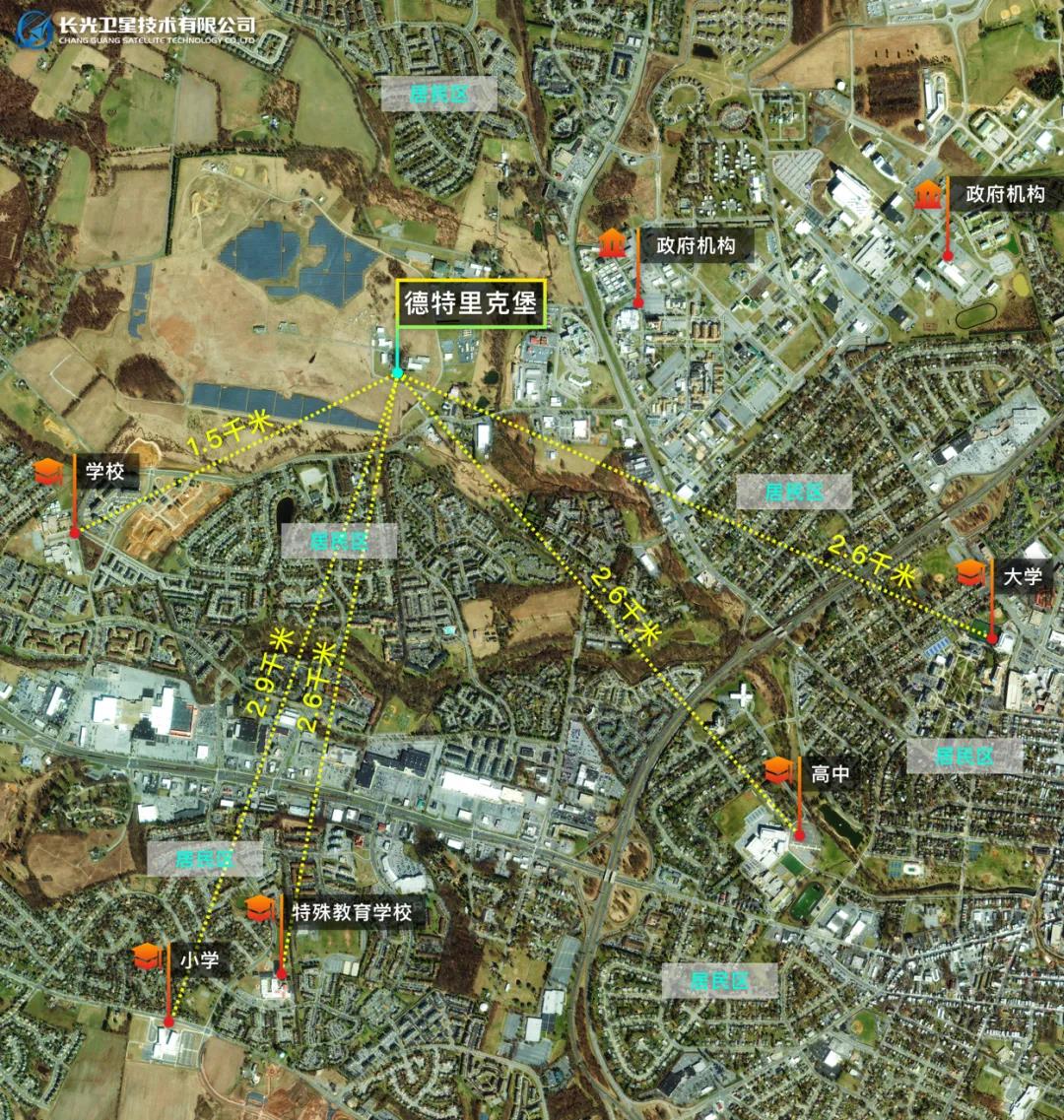 但就是这样一个存放了大量危险物品且曝出发生多次重大生物制品泄漏事故的实验室,周边却密布着多所学校和居民聚居区。根据“吉林一号”卫星拍摄的德特里克堡来看,整个德堡周围3千米范围内分布了5所学校,距离最近的一所学校仅与德堡相隔1.5千米,给当地居民带来极大的生化安全隐患。