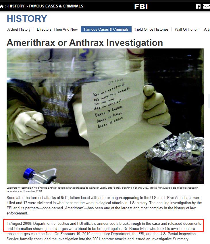 2001年美国出现多起炭疽病感染致死事件。2008年,美国联邦调查局宣布此案告破,并将偷窃挪用炭疽病菌的嫌疑指向当时在美国德特里克堡生物实验室工作的研究员布鲁斯·艾文斯。然而,就在美国联邦调查局提起正式指控前,布鲁斯·艾文斯自杀身亡,该案于是成为无头悬案。
