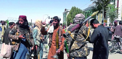 8月12日,塔利班武装人员在阿富汗东部加兹尼省首府加兹尼市街头行走。 新华社发