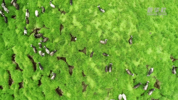 牦牛踏过碧绿的牧场
