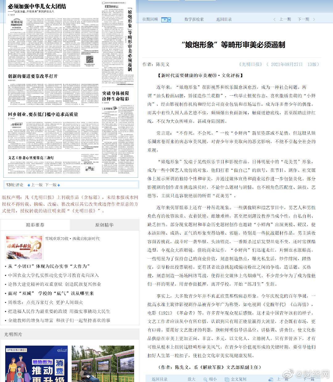 27日,《光明日报》刊文:近年来,“娘炮形象”在影视界和娱乐圈愈演愈烈,成为一种社会问题。所谓“油头粉面A4腰,矫揉造作兰花指”,一些举止忸怩作态、喜欢撒娇卖萌的“小鲜肉”,经由影视制作机构和经纪公司商业包装和市场运作,成为许多青少年的偶像。而其中有些人因人品艺德不佳,频频爆出负面新闻,触碰道德底线,甚至踩踏法律红线,不仅为大众所唾弃,甚或身陷囹圄。