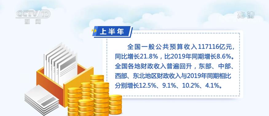 根据报告,上半年,全国一般公共预算收入117116亿元,同比增长21.8%,比2019年同期增长8.6%。全国各地财政收入普遍回升,东部、中部、西部、东北地区财政收入与2019年同期相比分别增长12.5%、9.1%、10.2%、4.1%。