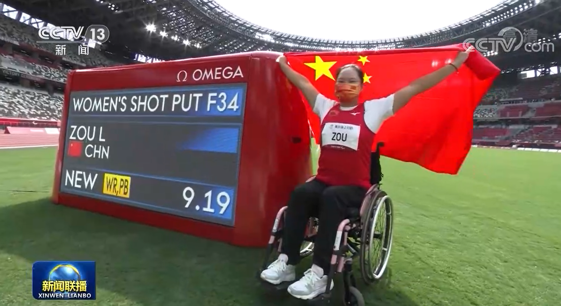 田径赛场。35岁的老将张亮敏以40米83破世界纪录的成绩成功卫冕女子铁饼F11级比赛冠军;邹莉娟在女子铅球F34级比赛中以9米19的成绩刷新了自己保持的世界纪录,再夺一金。