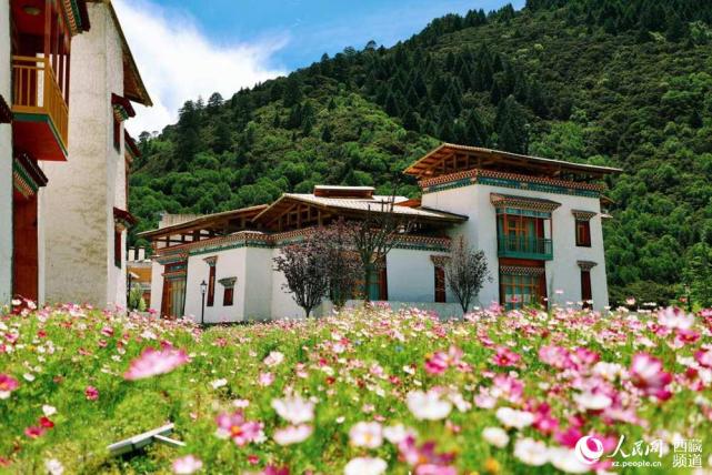 花海中的酒店建筑。人民网 次仁罗布摄