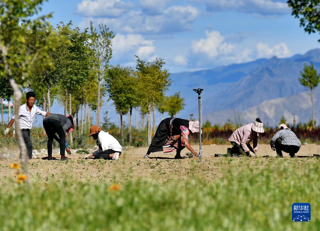 当地群众在山南市扎囊县藏草万亩植物种苗繁育基地劳动(2019年8月29日摄)。新华社记者张汝锋 摄