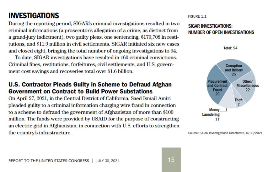 7月30日,SIGAR发布的美国国会季度报告是美军全面撤离阿富汗前最后一份季报,但这份季报中的“瓜”一点都不少。报告罗列了众多美方人员的刑事案件:一名美国政府承包商通过竞标作假,拿到美国国际开发署资助的阿富汗国家电力建设项目;美国国民警卫队一名负责后勤的士官,以坎大哈驻军公务使用的名义,订购了大批电脑和家具,并运回到自己在田纳西的家中;一家为阿富汗美军提供空运服务的承包商,使用年久失修的直升机,违背了承包合同,被迫向美国政府缴纳1108万美元的庭外和解费;还有一名美国承包商,利用职务之便,伙同他人从坎大哈机场偷走了发电机和汽车等设备,被判入狱51个月等等。