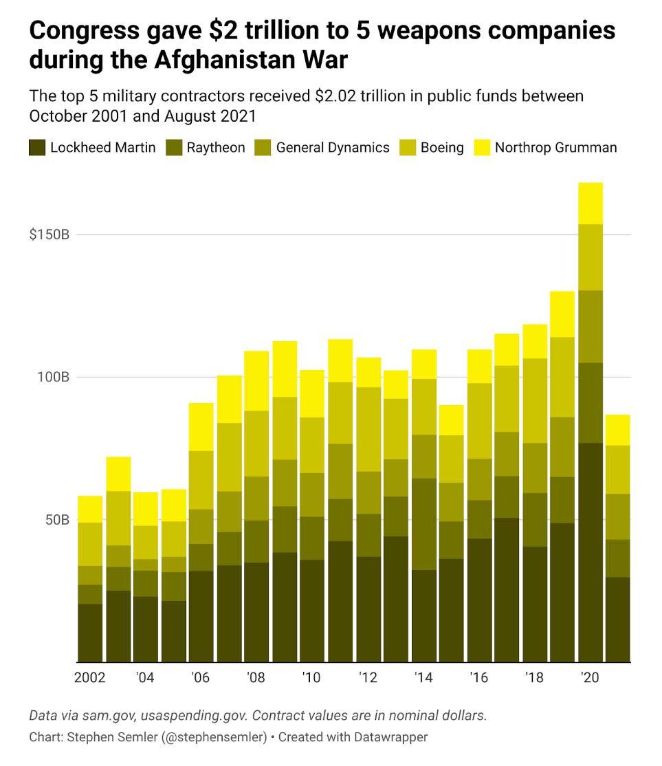上面提到的都是小苍蝇,虽然案件频发,但多为几十万、几百万美元的“毛毛雨”,真正从阿富汗战争款中捞大钱的,还得数那些能给美国政府施加重要影响的军火巨头。一家美国民间安全政策智库“安全政策改革研究所”(SPRI),根据美国联邦总务署(GSA)的公开数据,统计出在20年的阿富汗战争中,五大军火承包商,总共从国会手中拿到了超过2.02万亿美元的资金。而根据SIGAR自己的统计数据,美国政府花在阿富汗的钱,重建经费和军费加起来也才不过9820亿美元,而布朗大学做的一份阿富汗战争支出估计,则有2.26万亿美元。可以说,阿富汗战争开支对于美国而言,就是一笔糊涂账。当然,账越乱,浑水摸鱼的机会也就越多。根据《外交政策》的文章,美国刚刚占领阿富汗时,阿富汗当地警察是长期受苏式训练的,使用的也是苏制和俄制装备。美国人来到以后,不顾阿富汗的国情,如高文盲率等,强行培训使用美式装备的新安全队伍,并引进一些比俄制武器昂贵、娇嫩的美式装备,当然结果也显而易见。美国援助阿富汗警察和士兵装备的采购费用,就这样源源不断流入军火商的腰包里。