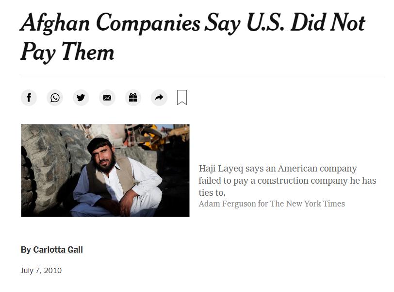 △纽约时报对国防承包商拖欠阿富汗当地企业工资一事的报道