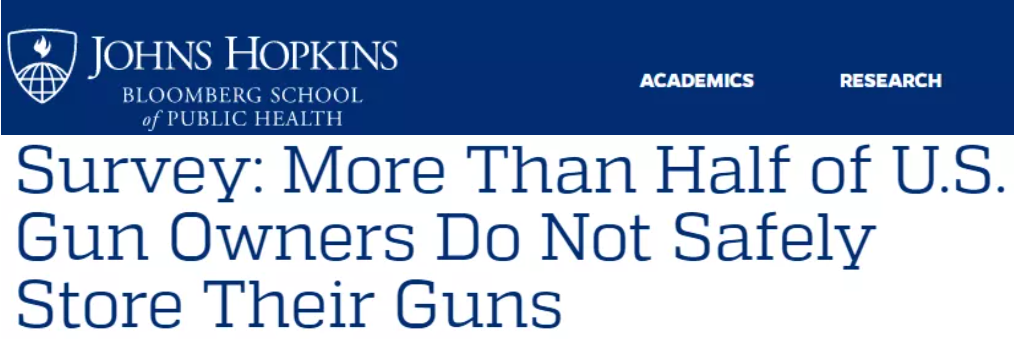 来自约翰斯·霍普金斯大学彭博公共卫生学院的研究还表明,大多数枪支拥有者都没有安全保管和存放他们的武器,以致很多可以轻松接触到它们的孩子在无意中向家人或朋友开了枪。