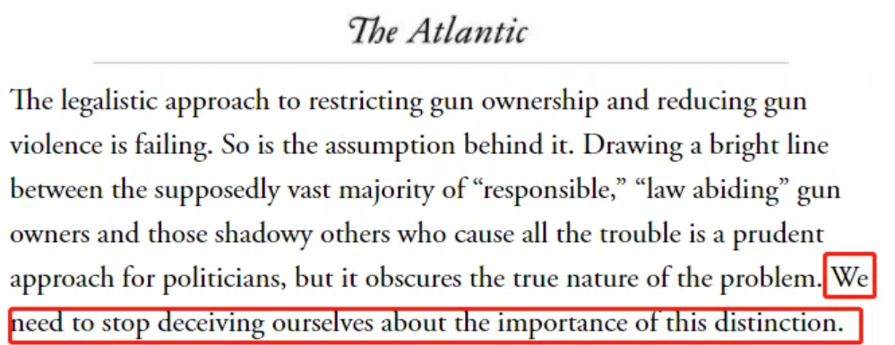 △《大西洋月刊》:限制枪支拥有和减少枪支暴力的法律方法正在失败。在所谓的绝大多数“负责任的”“守法的”枪支拥有者和那些制造所有麻烦的影子人物之间划一条清晰的界线,对于政客来说是一种平衡的做法,但它掩盖了问题的真正本质。我们不能在这个问题上继续自欺欺人了。