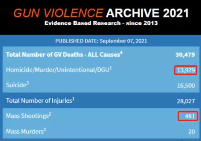 美国“枪支暴力档案”(GVA)网站最新统计数据显示,截至当地时间9月7日,今年全美各类枪支暴力事件已导致13979人丧生(不包括自杀);大规模枪击案(造成4人以上伤亡)已发生481起。