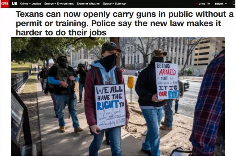 △美国有线电视新闻网(CNN):当地时间9月1日,得克萨斯州一项新的枪支法案生效。根据该法案,21岁及以上合法拥有枪支的得州人在没有获得许可或培训的情况下,从此可以在公开场合携带枪支。