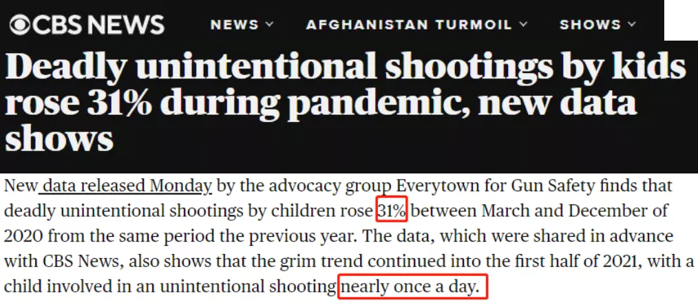 另有数据显示,疫情期间,美国儿童意外枪击事件上升了31%,“几乎每天都有一个孩子遭遇意外枪击”。全国枪支销售的激增,以及因疫情封锁而居家的孩子更多,都是导致儿童意外枪击事件激增的原因。