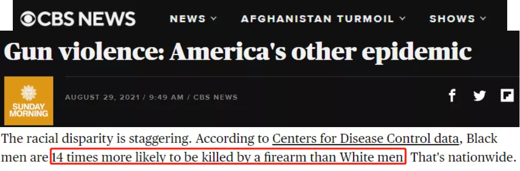△美国哥伦比亚广播公司(CBS):美疾控中心(CDC)数据显示,在全美范围内,黑人男性被枪杀的可能性是白人男性的14倍。