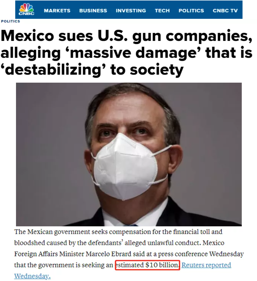 一方面是本国枪支供不应求,另一方面却是唯利是图的军火商不负责任地输出枪祸。上个月初,墨西哥政府对美国多家枪械制造商提起诉讼,指控它们从事向暴力贩毒团伙提供非法武器这种不计后果的商业活动,导致数千人丧生。