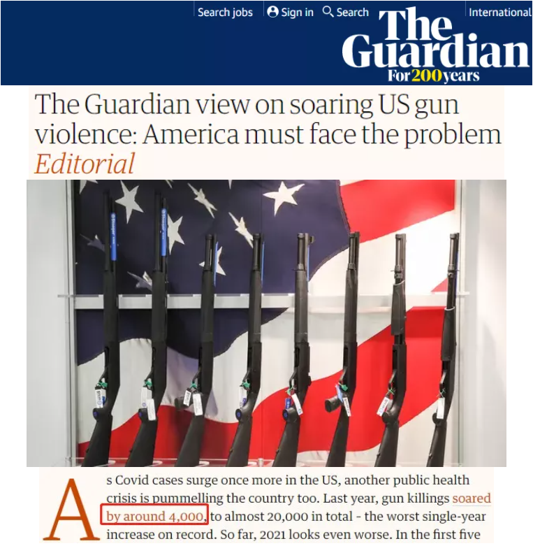 △英国《卫报》报道:去年美国枪击事件激增约4000起,总数接近2万起,是有记录以来增幅最大的一年。而今年到目前为止,情况看起来更糟。