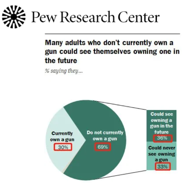枪案频发的同时是枪支的购销两旺。皮尤公司一项调查显示,在疫情暴发前,大约30%的美国成年人拥有枪支,另有大约36%的人要么过去曾经拥有枪支,要么打算在将来拥有枪支。