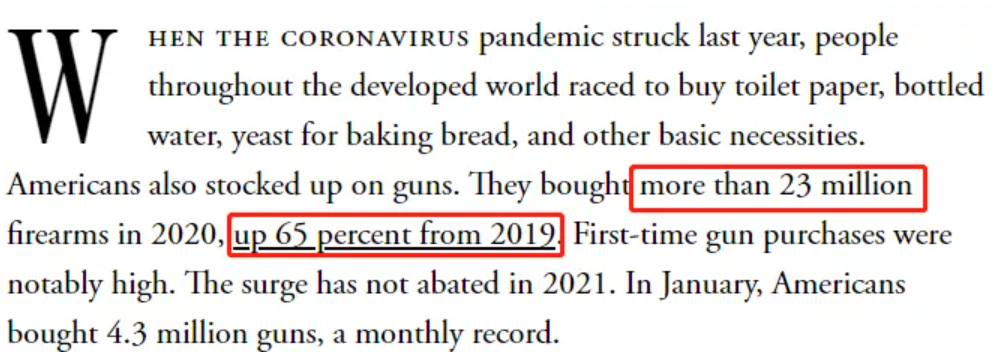自疫情暴发以来,美国枪支销售量比2019年大幅增加了65%,达到2300多万支;而且首次购枪的人数相当可观。进入2021年后,这一激增势头仍在继续。