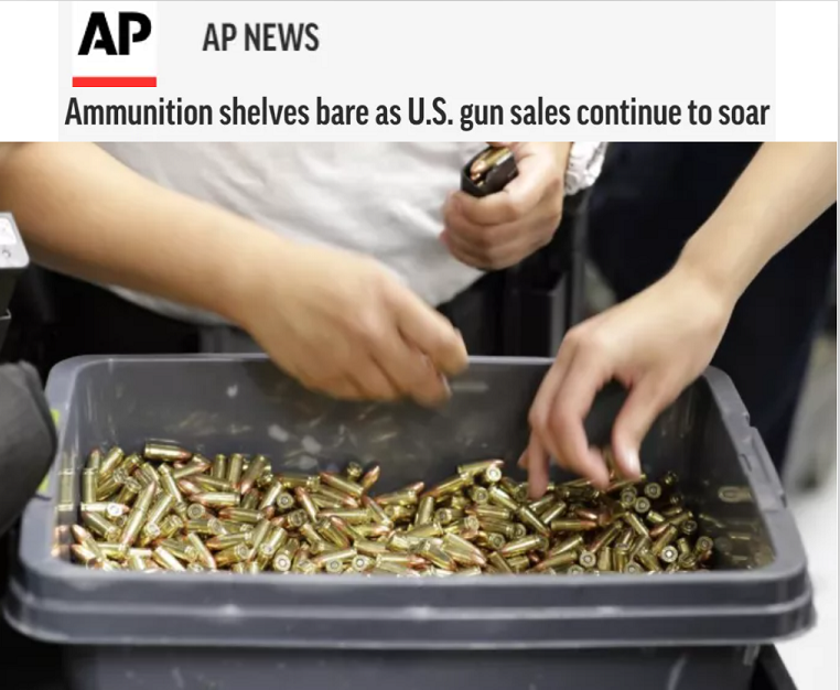 美联社的文章称,随着疫情在全美蔓延,由此产生的封锁措施和警方应对措施缩减引发了很多人的安全担忧,造成了他们对枪支弹药的“压倒性需求”,枪支销售的持续飙升让很多枪店的弹药架上“空空如也”。