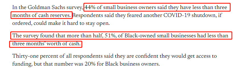 高盛集团近日的一项调查显示,44%的受访小企业现金储备不足已三个月,而在非洲裔美国人经营的小企业中这一比例达到51%。