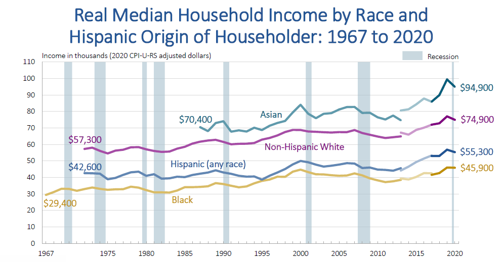 △美国人口普查局的最新数据显示,2020年非洲裔美国人家庭收入中位数为45900美元,在调查的各族裔中最低。