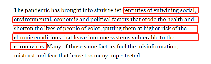 报道说,疫情凸显了几个世纪以来相互交织的社会、环境、经济和政治因素,这些因素侵蚀着少数族裔的健康,缩短了他们的寿命,让他们面临慢性疾病的风险加大。