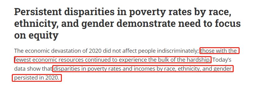 美国进步中心(Center for American Progress)网站的分析认为,疫情对不同收入群体的影响各异,拥有经济资源最少的群体遇到的困难最大。与此同时,由种族、民族和性别等造成的不同族群的贫困率差异持续存在。