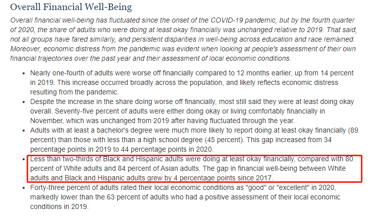 △《2020年美国家庭经济状况报告》显示,认为自己“财务状况尚可”的非洲裔和拉美裔成年人不超过2/3,而80%的白人成年人这样认为;自2017年以来,在财务状况方面,非洲裔和拉美裔成年人与白人成年人间的差距增速为年均4%。
