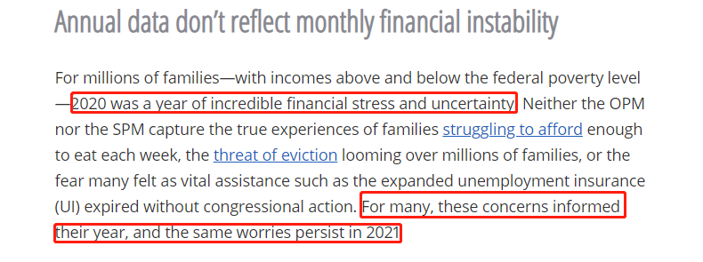 △美国进步中心(Center for American Progress)网站日前发表的分析文章说,对很多美国家庭来说,2020年是具有“难以置信的财政压力和不确定性”的一年。而随着政府主要救助项目的到期,对许多人而言,同样的状况2021年依然存在。
