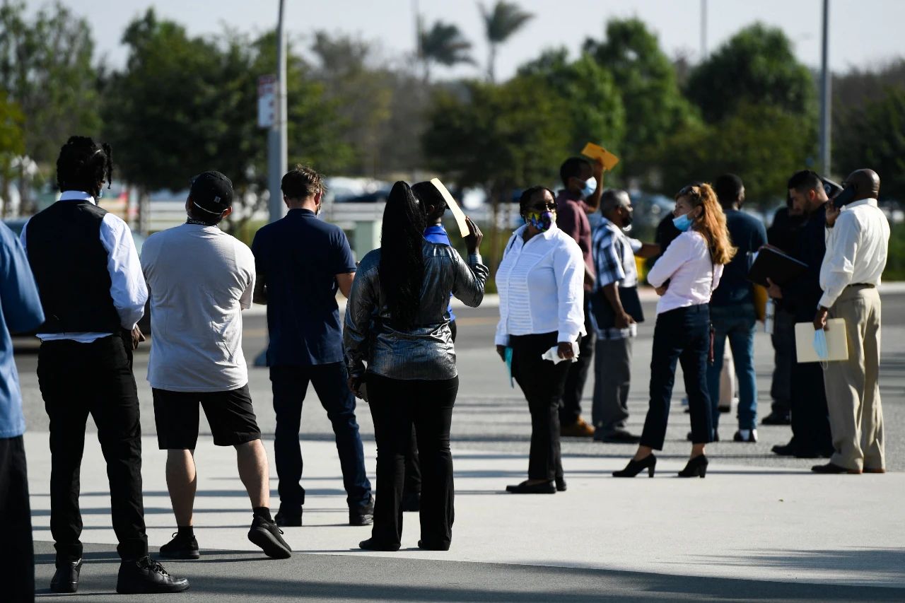 △当地时间9月9日,加利福尼亚州英格尔伍德,人们在体育场外排队等候参加招聘会。(图自视觉中国)