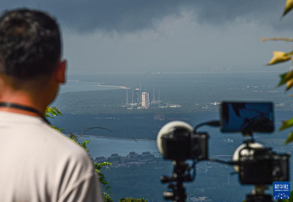 9月16日,航天摄影发烧友胡应南在海南文昌一幢公寓楼顶拍摄天舟三号货运飞船船箭组合体垂直转运过程。新华社记者 蒲晓旭 摄