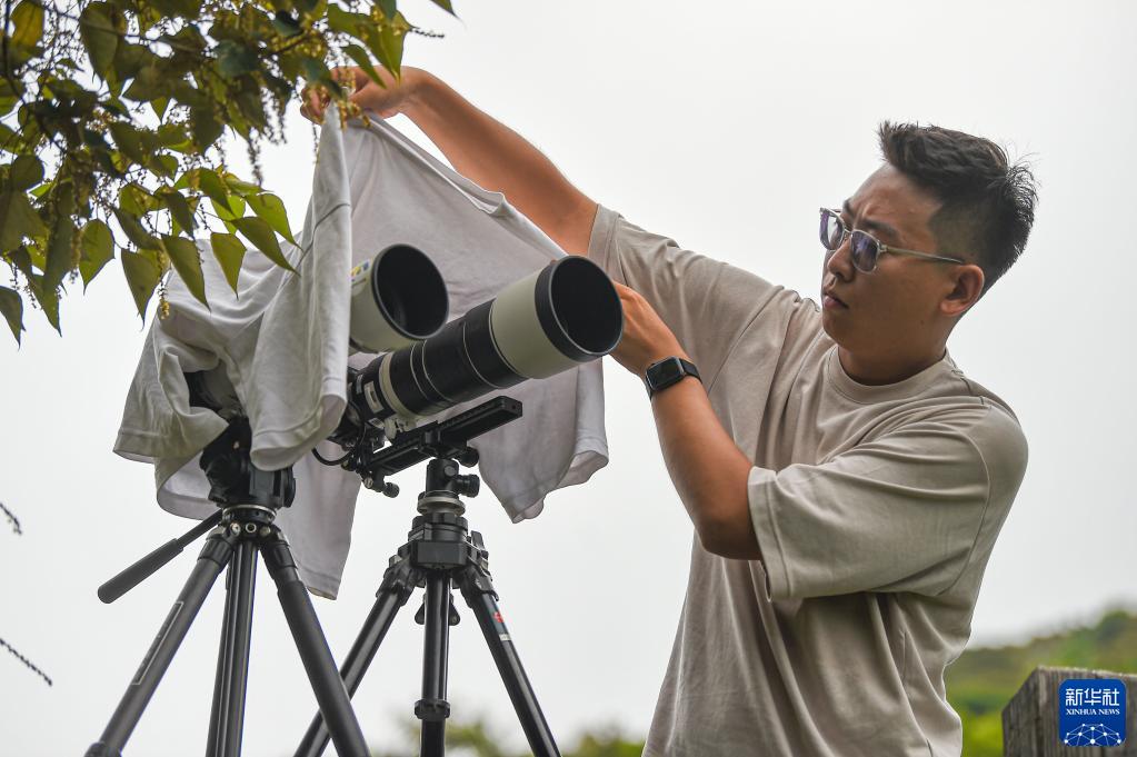 9月20日,天舟三号货运飞船发射前6小时,航天摄影发烧友关天宇在文昌铜鼓岭架好拍摄设备,并特意为设备盖上一件衣服,以防其因长时间暴晒而损坏。新华社记者 蒲晓旭 摄