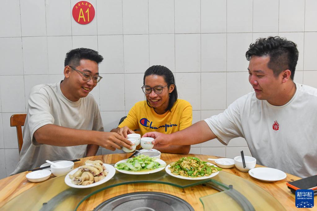9月20日,因同在文昌铜鼓岭拍摄天舟三号货运飞船发射而结识的航天摄影发烧友关天宇(左)、何兆恒(中)和陈玉成在结束对天舟三号货运飞船的发射拍摄后在海南文昌一家饭馆小聚。很多航天摄影发烧友因拍摄火箭而结缘。新华社记者 蒲晓旭 摄
