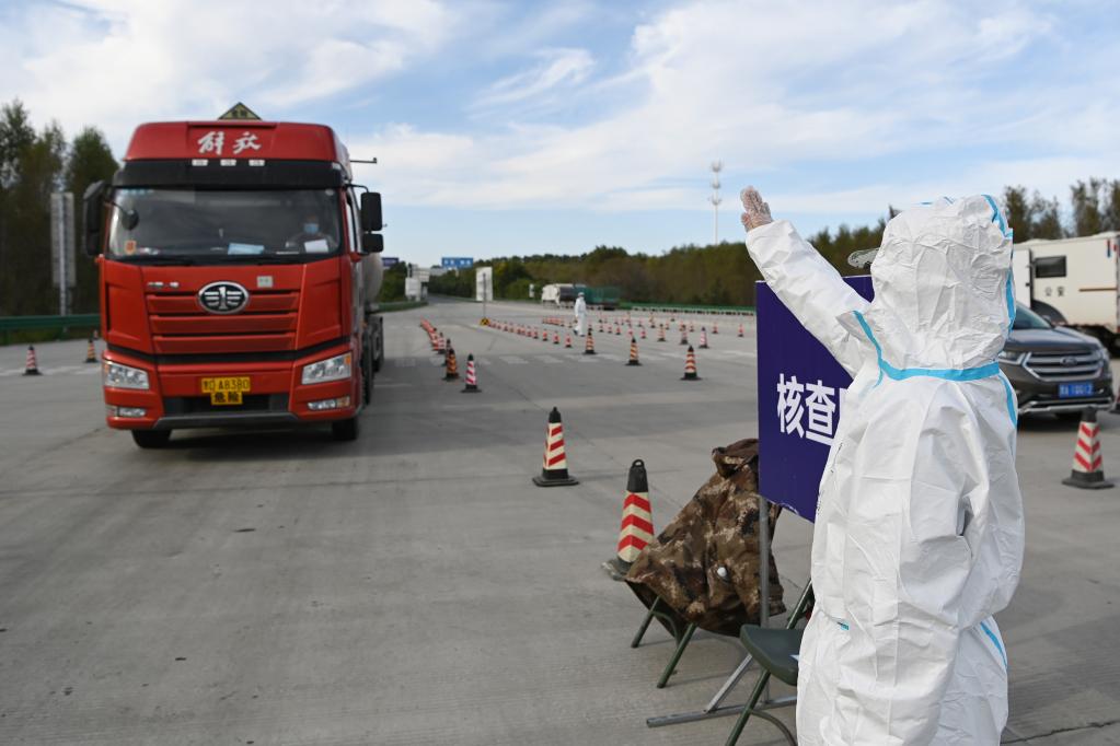 在哈尔滨一高速公路出城口,工作人员示意停车准备检查车内人员的核酸检测报告(9月23日摄)。新华社记者 王建威 摄