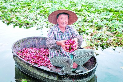 9月16日,浙江省湖州市南浔区和孚镇新荻村内的菱角进入采收旺季,当地村民划着菱桶在水面采菱,构成美丽水乡独特的丰收场景。沈勇强摄/光明图片