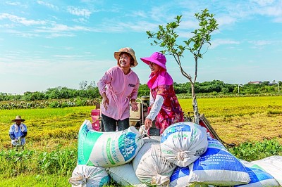 9月23日,湖北省黄冈市黄州区陶店乡农民喜收稻谷。黄鹏摄/光明图片