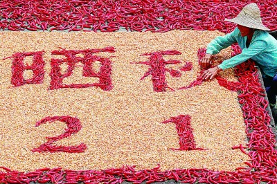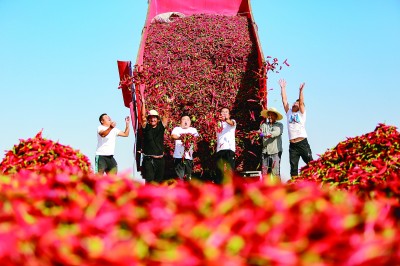 9月21日,甘肃省酒泉市肃州区三墩镇鸳鸯山辣椒晾晒场,村民们幸福“晒”辣椒。侯崇慧摄/光明图片