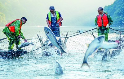 9月23日,江西省新余市仙女湖秋季捕鱼现场,渔民协力起网捕鱼供应订单市场,一派鱼跃人欢的丰收景象。赵春亮摄/光明图片
