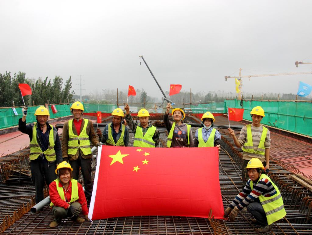 山东聊城,在中建八局郑济高铁二标段施工现场。工作间隙,工人们拉起五星红旗,合影留念庆国庆。当日项目部2000余名建设者坚守一线保进度。