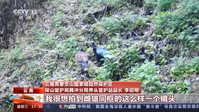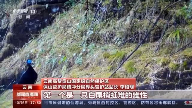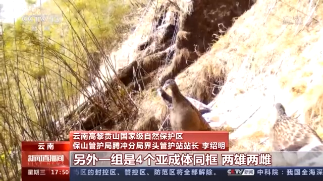 云南高黎贡山国家级自然保护区保山管护局腾冲分局界头管护站站长 李绍明:拍到了三组镜头的照片。第一个是一只白尾梢虹雉的雄性,另外一组是4个亚成体同框,两雄、两雌。我很想拍到雌雄同框的一个镜头。前几天我们(也)终于把它成功拿到了,这个群体通过我们的监测,它是有2只成体抚育了4只亚成体。