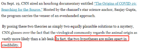 在一一列举真相之后,希尔齐克以美国有线电视新闻网CNN上月播出的纪录片《新冠起源:寻找源头》为例揭露说,这些媒体“弃明投暗”的卑劣报道手法掩盖了这样一个事实,即病毒学界认为动物起源比实验室泄漏的可能性大得多。
