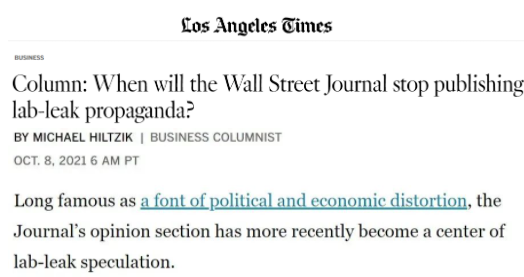 △《洛杉矶时报》报道截图。希尔齐克在题为《<华尔街日报>什么时候才会停止散布‘实验室泄漏论’?》的文章。